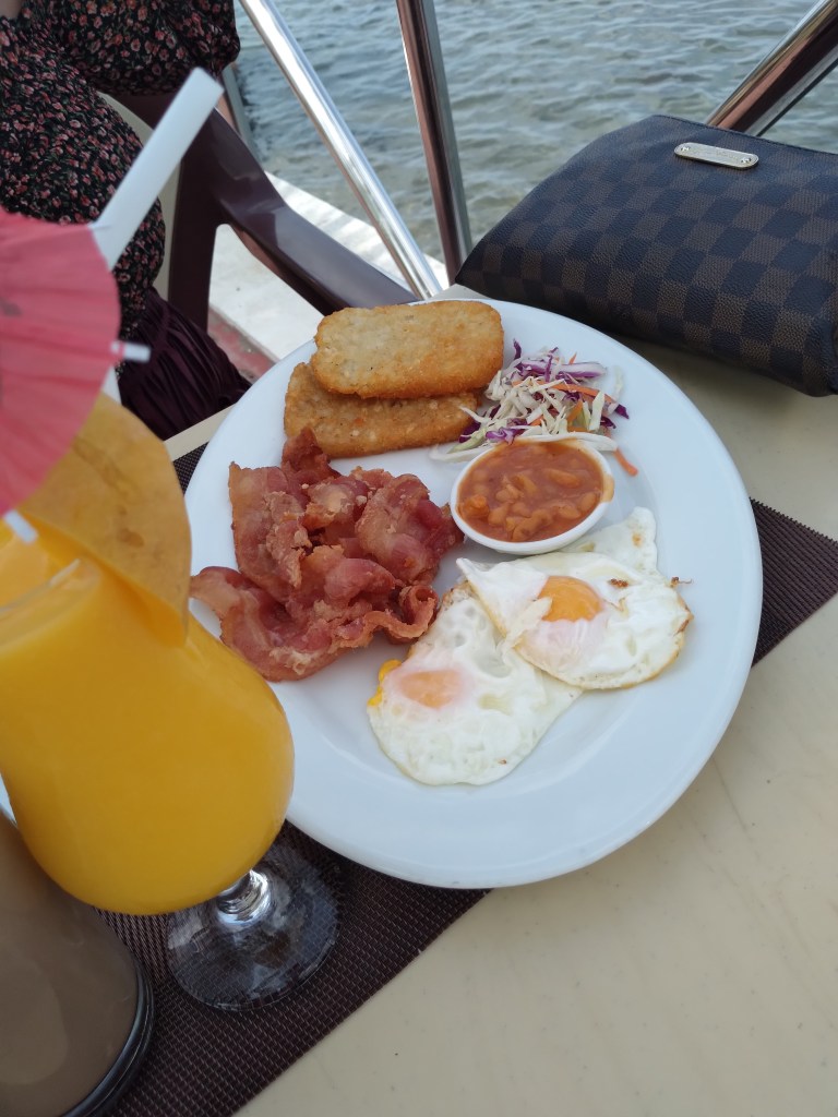 Per usual, breakfast was ordered and served, beef steak and bacon and eggs.